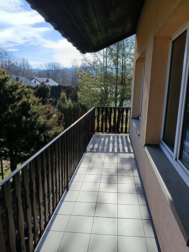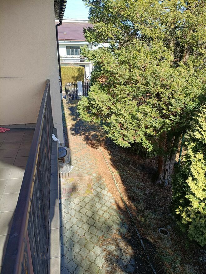 Duży zadaszony taras nad garażem od strony zachodniej, dodatkowo drugi zadaszony balkon od strony wschodniej. Duże zadaszenie nad wjazdem do garażu. Podjazd do garażu wystarczającej wielkości na zaparkowanie dwóch samochodów.