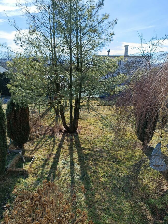 Duży zadbany ogród od strony południowej z drzewami ozdobnymi i owocowymi.