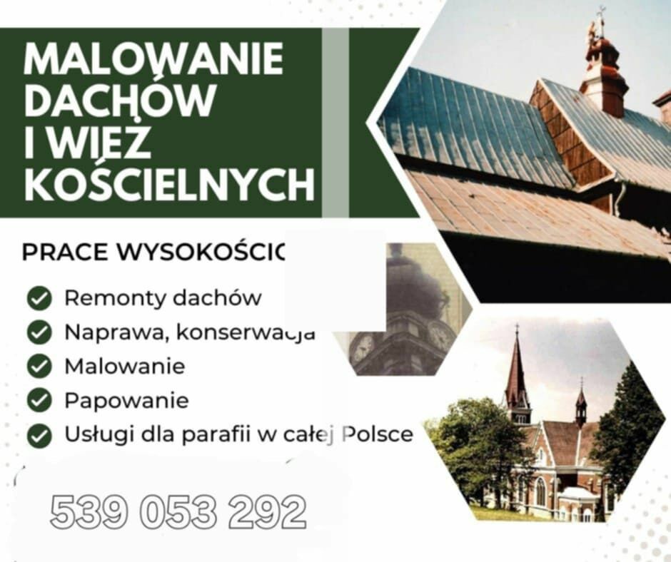 Malowanie naprawa remonty Wież Kościelnych malowanie naprawa krzyży Złocenie kopulek Usługi blacharskich Malowanie Dachów Malowanie konserwacja naprawa obiektów drewnianych Jeżeli w waszej parafii planowany jest Remont malowanie Wieży kościelnej lub jakieś prace na Wysokościach To zapraszam do współpracy Jacek Działamy Na Terenie całej Polski Pogotowie Wysokosciowe24 hSprawdź zainteresowanie tym ogłoszeniem